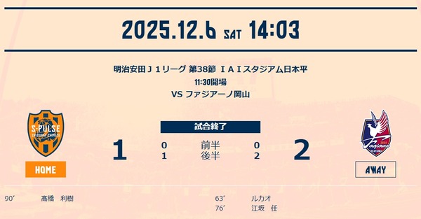 清水エスパルス vs ファジアーノ岡山|秋葉清水3連敗で終幕。こ···