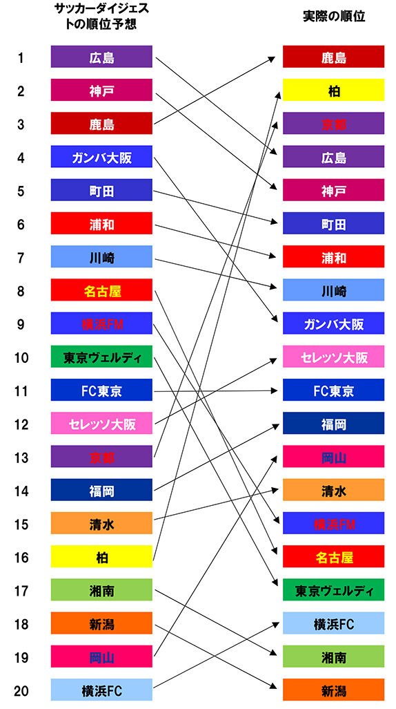 サッカーダイジェストがJ開幕前に順位予想を発表し、各専門家の予想と、それを集計した「総合ランク」が示される。だいたいこういうものは、シー···